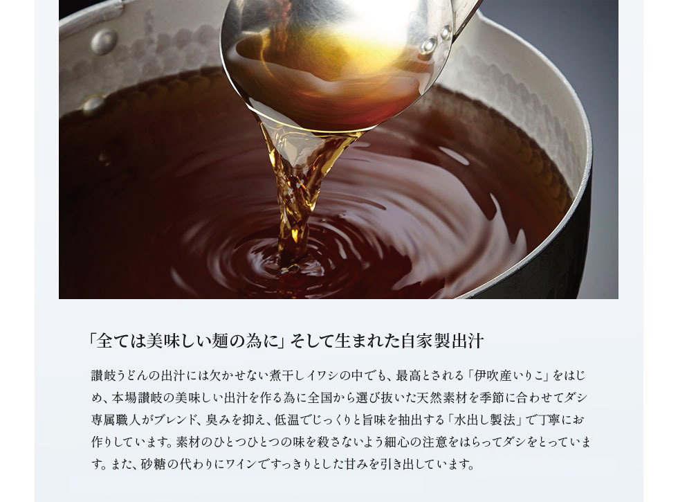 ●ぶっかけだし:しょうゆ(国内製造),みりん, 赤ワイン,白ワイン,清酒 , 煮干(香川県伊吹島産), うるめ節 , 昆布 ,かつお節 , さば節 , めしか節 米酢 , (原材料 の一部に小麦 , 大豆 , さばを含む)