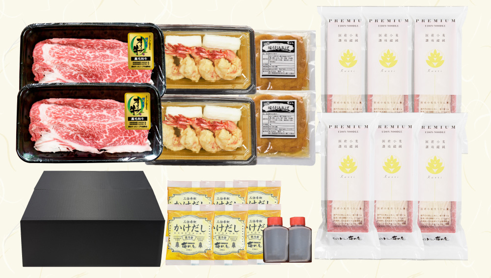 プレミアム生うどんで食べる特選具材うどん(王様のグルメシリーズ)3種を一つにした特別セットです。大切な方への贈り物として、自分へのご褒美としてご活用いただける究極の亀城庵本場讃岐うどんセットです。
